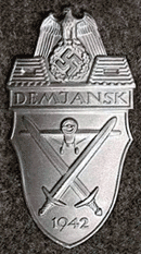 Нарукавный знак «Демянский щит» был учрежден 25 апреля 1943 г. Им награждались офицеры и солдаты вермахта за участие в боях в Демянском котле. Военнослужащие сухопутных войск награждались за нахождение в окружении в течение 60 дней, за получение ранения во время службы в окружении и за проявление храбрости. Военнослужащие люфтваффе награждались за выполнение 50 боевых заданий по поддержке осажденных войск. Первый список представленных к награждению этим знаком был составлен 31 декабря 1943 г. Общее число награжденных — около 100 000 человек. 8 февраля 1942 г. советские войска взяли в окружение 2-й армейский корпус в небольшом городке Демянск. В котел попали части 12-й, 30-й, 32-й, 223-й и 290-й пехотных дивизий, а также 3-я дивизия СС. Гарнизон полностью снабжался и обеспечивался силами люфтваффе. Во время осады, длившейся 14 месяцев, окруженные войска выдерживали натиск трех советских армий. Операция по прорыву окружения и отводу германских войск с демянского плацдарма началась 21 февраля 1943 г. Из примерно 100 000 человек, попавших в окружение, 3335 погибли и около 10 000 были ранены. За успешное командование генерал войск СС Теодор Эйке был удостоен награды «Дубовые Листья» к Рыцарскому кресту.