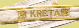 Нарукавная лента «Крит» была учреждена октября 1942 г. Ею награждались участники десантной операции по захвату острова Крит в мае 1941 г. Условия награждения следующие: участие в высадке (парашютной, морской или при помощи планеров) в период с 20 по 27 мая 1942 г.; участие в воздушных боях в ходе битвы за остров; участие в морских операциях в данный период; участие в патрулировании прибрежных вод и в морских боях до 19 июня 1941 г. Лента изготавливалась из белой ткани (на основе хлопка), с желтой каймой по краям. Надпись «KRETA» в центре ленты тоже была вышита нитками золотистого цвета с элементами греческого орнамента с двух сторон. Ленту носили на левом рукаве. После поражения в Греции британский Экспедиционный корпус и остатки греческой армии были эвакуированы на остров Крит. Остров имел важное стратегическое значение, предоставляя контроль над коммуникациями в восточной части Средиземного моря и возможность нанесения авиаударов по нефтяным месторождениям Румынии. Немецкое командование приняло решение захватить остров. 20 мая 1941 г. началась операция «Меркурий» по захвату острова, в которой было задействовано с немецкой стороны 22 000 человек (против 27 500 англичан и 14 000 греков). Главную роль в ходе боев сыграли германские парашютисты, сумевшие овладеть ключевыми пунктами обороны. При этом они понесли настолько тяжелые потери, что A. Гитлер впредь запретил проводить десантные операции такого рода. 30 июня 1941 г. большая часть острова находилась под контролем Германии. В первых числах июля были подавлены последние очаги сопротивления.